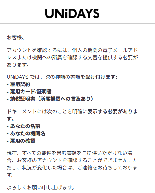 私の場合は、オンラインでの審査を通過できる書類ではなかったようで、なぜか上記のようなメッセージが届きました。私はPTA役員であって、幼稚園に雇用されているわけではないため当然雇用契約書も納税証明書もありません。